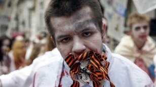 A demonstrator dressed as a zombie protests in Ukraine against Russian propaganda by stuffing his mouth with newsprint and St. George's ribbons, a symbol used by pro-Russia rebels in the east.