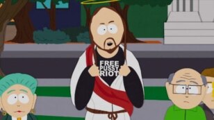 In an episode from Trey Parker and Matt Stone's fictional American town that takes aim at disgraced U.S. cyclist Lance Armstrong, religion, and America's appetite for good causes, the Son of God flashes a T-shirt with "Free Pussy Riot" written across it before shouting the same to followers.