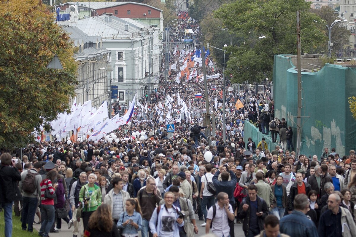 The Moscow marchers, who assembled near Pushkin Square, marched through the city to a rallying point on Prospekt Sacharova. There, opposition leaders took turns addressing the crowd.