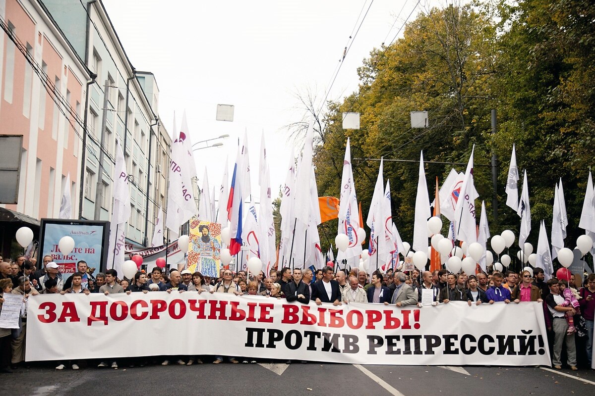 "Our main aim is to force the authorities to start a dialogue," activist Sergei Udaltsov told protesters. "The summer went by -- it's been three months since our last march. Not a single demand [of the last protest march] has been met. Not a single political prisoner has been released -- on the contrary, repressions only picked up pace, more people have been arrested."