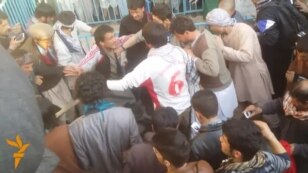 Footage obtained by RFE/RL shows a large crowd comprised mainly of young men repeatedly kicking and beating the woman. Some throw stones and buckets at her as she struggles to get off the ground.