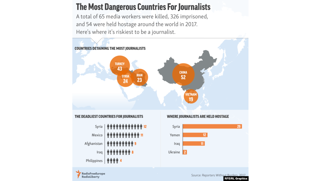 War-torn Syria remains the most dangerous country for journalists, with 12 reporters killed in 2017. In neighboring Iraq, eight journalists were killed.