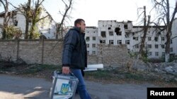 From RFE/RL's Ukrainian Service, Members of the Ukrainian military cast ballots at a polling station in Kramatorsk in the country's parliamentary elections on October 26. In the city of Lviv, soldiers wounded in the conflict in the country's east voted from their hospital rooms, where election workers brought ballot boxes.