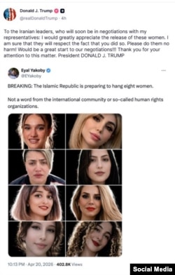 Trump’s post included an X post from earlier in the day in which pro-Israel activist Eyal Yakoby wrote that Iran “is preparing to hang eight women.”
