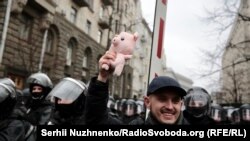 Police said members of several nationalist groups threw toy pigs -- symbolizing corruption -- at security forces and called for Oleh Hladkovskiy, the former first deputy secretary of the National Security Defense Council, to be arrested for alleged embezzlement.